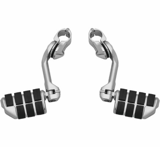 These cruise mounts with positive locking Quick Clamps offer an incredible range of adjustability. The entire assembly may be moved up or down on the engine guard. The arm and footpeg may be further adjusted along a vertical or horizontal arc. A unique clevis permits angle adjustment of the footpeg. The heavy-duty Quick Clamp and sturdy offset arm ensures that the footpegs will clear fairing lowers and will stay where you put them.