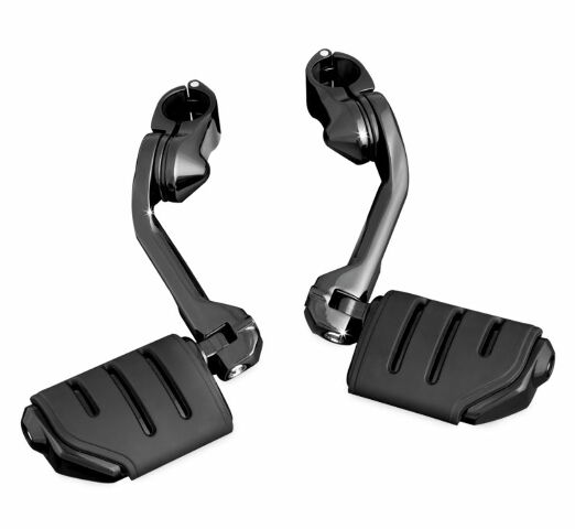 These cruise mounts with positive locking Quick Clamps offer an incredible range of adjustability. The entire assembly may be moved up or down on the engine guard. The arm and footpeg may be further adjusted along a vertical or horizontal arc. A unique clevis permits angle adjustment of the footpeg. The heavy-duty Quick Clamp and sturdy offset arm ensures that the footpegs will clear fairing lowers and will stay where you put them.