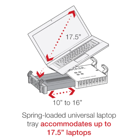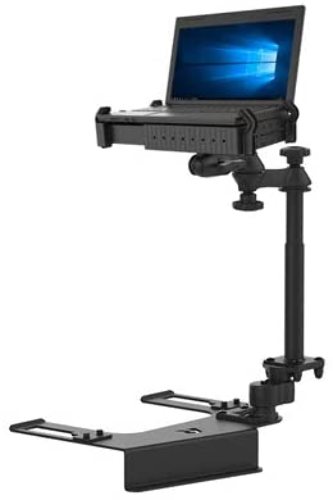 OVERVIEW This RAM® No-Drill™ laptop stand system installs quickly and easily into a variety of Chevrolet and GMC vehicles using the existing hardware of the passenger side seat rails. This configuration provides a telescoping feature that ranges from 12” to 18”. Dual swing arms provide articulation and 12” of reach for passenger and driver access to the mounted device. RAM® rubber ball and socket technology provides additional adjustability as well as shock and vibration isolation. The spring-loaded RAM® Tough-Tray™ laptop holder accommodates 10” to 16” wide laptops, and 17” wide screens. The tray features four adjustable retaining arms with rubber grips that can be moved both vertically and horizontally. These arms allow for a custom fit for laptops of varying thickness while not blocking drives or ports. A screen support and USB light are also available to accessorize the RAM® Tough-Tray™. In addition, hole patterns on the perimeter of the laptop holder are compatible with several RAM® mounting solutions.