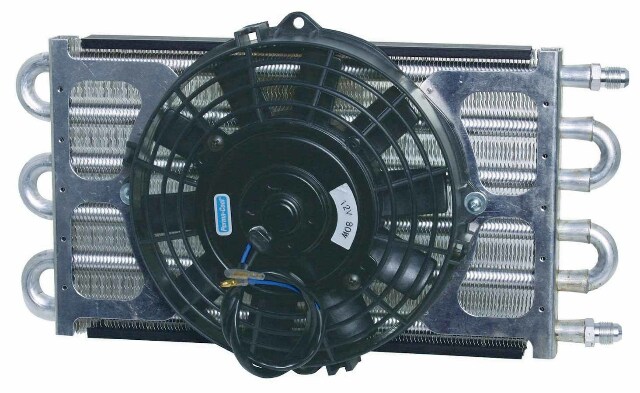 Fluid Cooler and Fan - Maxi-Cool Jr - 6 Pass - 15.500 x 7.500 x 3 in - Tube Type - 6 AN Male Inlet / Outlet - 11/32 in Hose Barb Adapters - 8 in Fan - Aluminum - Natural - Each
