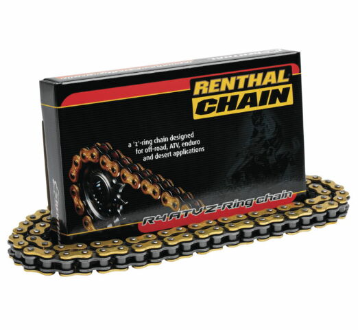 Renthal's R4 ATV chain is a premium-strength, Z-ring chain with excellent impact load resistance, designed specifically to withstand the stress found in ATV applications. The R4 chain features a heavier duty construction process and materials, which increases its service life and tensile strength. The patented "spring effect" Z-rings guarantee constant lubrication for longer life and pins manufactured from special alloy steel also contribute to better resistance from wear. Thicker side plates and a quad riveting manufacturing process round out the upgrades on this ATV specific chain.
