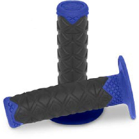 Spider Motorsports Grips use specially formulated compounds that retain tackiness when wet. These compounds molded into diamond web design shed water and make it easier to hold on for better control and less fatigue. Firm first layer reflects vibration and increase durability. Integrated safety wire grooves. End caps reinforced to improve durability. Softer gel outer layer sheds mud and water, increases gripping power, reduces vibration for more comfort - less fatigue. Off road grips. 7/8 " / 1"