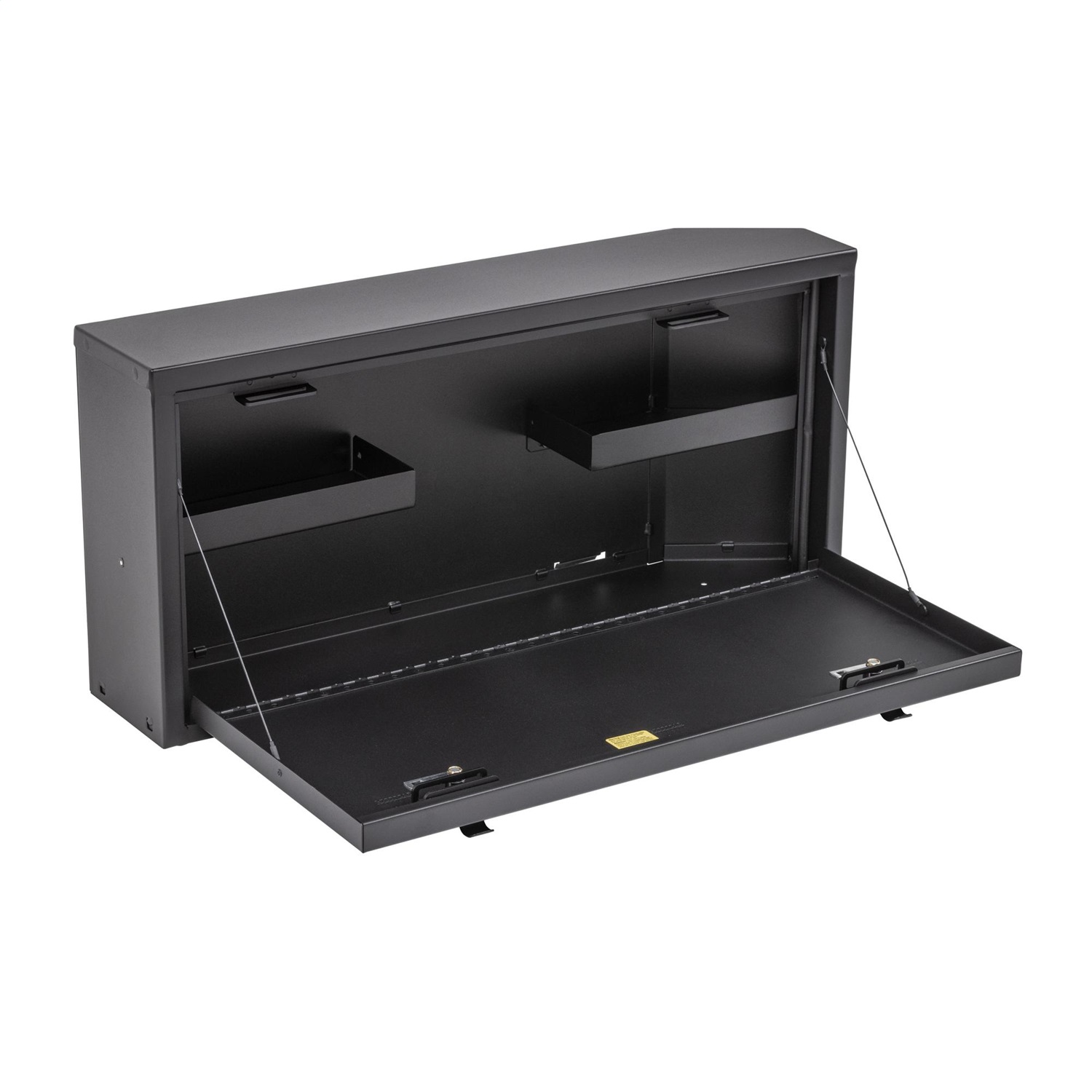 This heavy duty, high security lock box mounts on the inside of the Jeep Wrangler JK tailgate providing ample secure storage for tools and other gear. The door folds down creating a work table for cooking or quick sorting and access of your stuff. The Tailgate Lock Box comes equipped with 2 removable shelves for organization of smaller items. The entire Tuffy JK Tailgate Lock Box is constructed using welded 18-gauge steel, heavy duty fasteners and is covered with a durable textured powder coat finish. The JK Tailgate Lock Box installs to the JK Tailgate Rail mounts using standard hand tools with or without an OEM hardtop. Featuring Tuffy's Pry-Guard Locking System with a 10-tumbler double bitted security lock with built in weather seals.